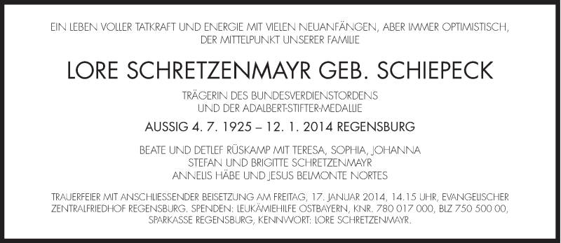 Zusätzlich erforschte sie auch die Familie ihres 1987 verstorbenen Gatten, des Architekten Helmut Schretzenmayr aus Lauingen/Donau und darüberhinaus alle Namensträger Schretzenmayr weltweit.